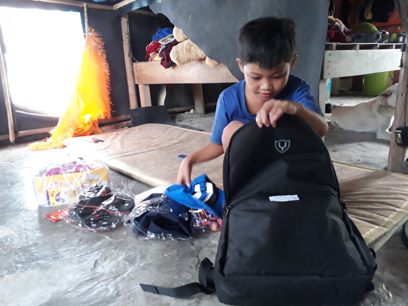 Bộ quần áo mới và giày đi học này còn được chính các cô chú ướm thử cho em hôm cô chú đến thăm nhà. Nhà em nhỏ quá, các cô chú phải vừa đứng trong vừa đứng ngoài để trò chuyện cùng ba và hai anh em em, nhưng nhà nhỏ làm tiếng cười nghe cũng ấm hơn. Mà hôm đó, quá trời nụ cười em muốn nhớ, chưa kể tiếng lao nhao của đàn chó mới sinh nữa. Cô chú chụp cho em một loạt ảnh, tấm nào cũng tươi thế này đây.