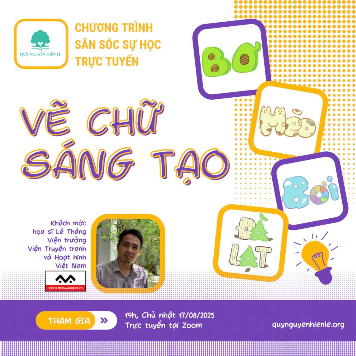 VẼ CHỮ SÁNG TẠO là buổi workshop ngoại khóa nằm trong chương trình săn sóc sự học trực tuyến của Quỹ dành cho các em thuộc gia đình Học bổng Nguyễn Hiến Lê. Chương trình cũng mở rộng cho con em của quý bạn đồng hành tham gia.