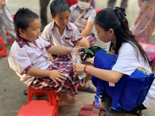 Hường mang giày cho các bạn nhỏ đồng hương khi tham gia chuyến KiraKira 29 – Thạnh Phú cùng Quỹ vào mùa hè 2023.