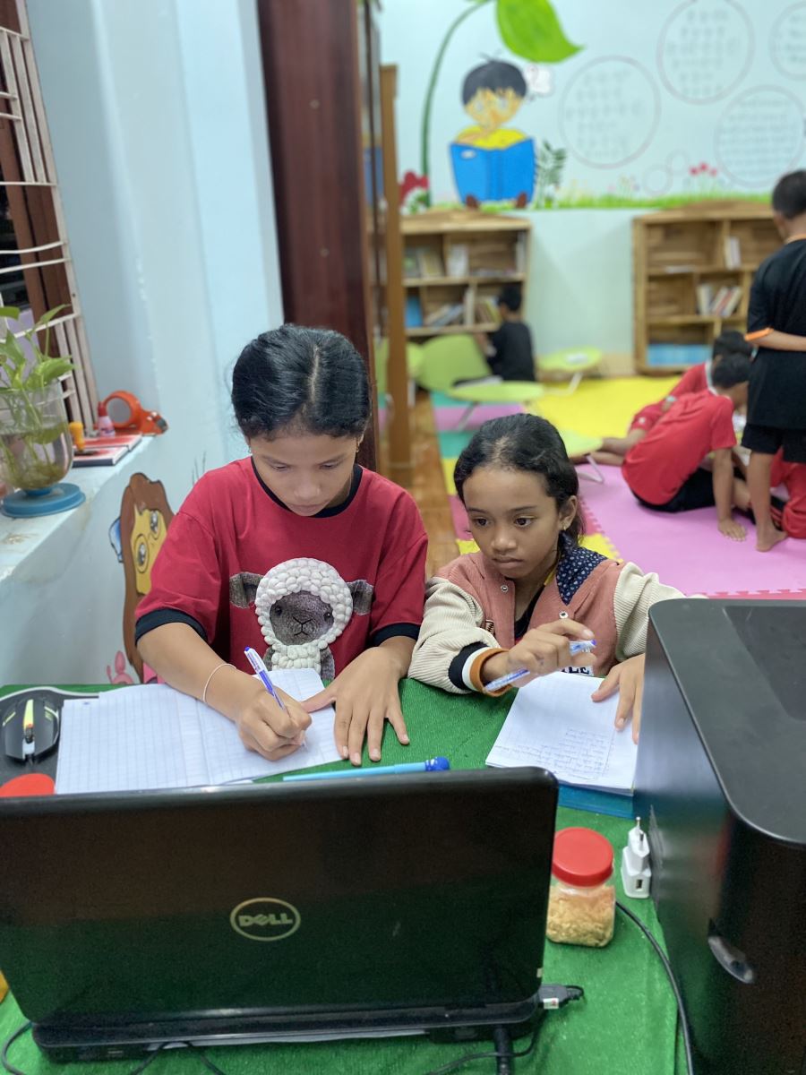 Để có thể học tiếng Anh trực tuyến như các bạn, các em học sinh ở Thuận Bắc trong đội học bổng Ninh Thuận đã trải qua hành trình khá... gian nan cùng Quỹ. Không phải em nào cũng có điện thoại người nhà có nối mạng, chưa kể có em mắt yếu không thể học trên điện thoại; Quỹ trước mắt lại chỉ trang bị được 5 máy tính nên phải chọn điểm hẹn dễ nối mạng và có người giữ dùm laptop để các em đến học và dùng chung máy.