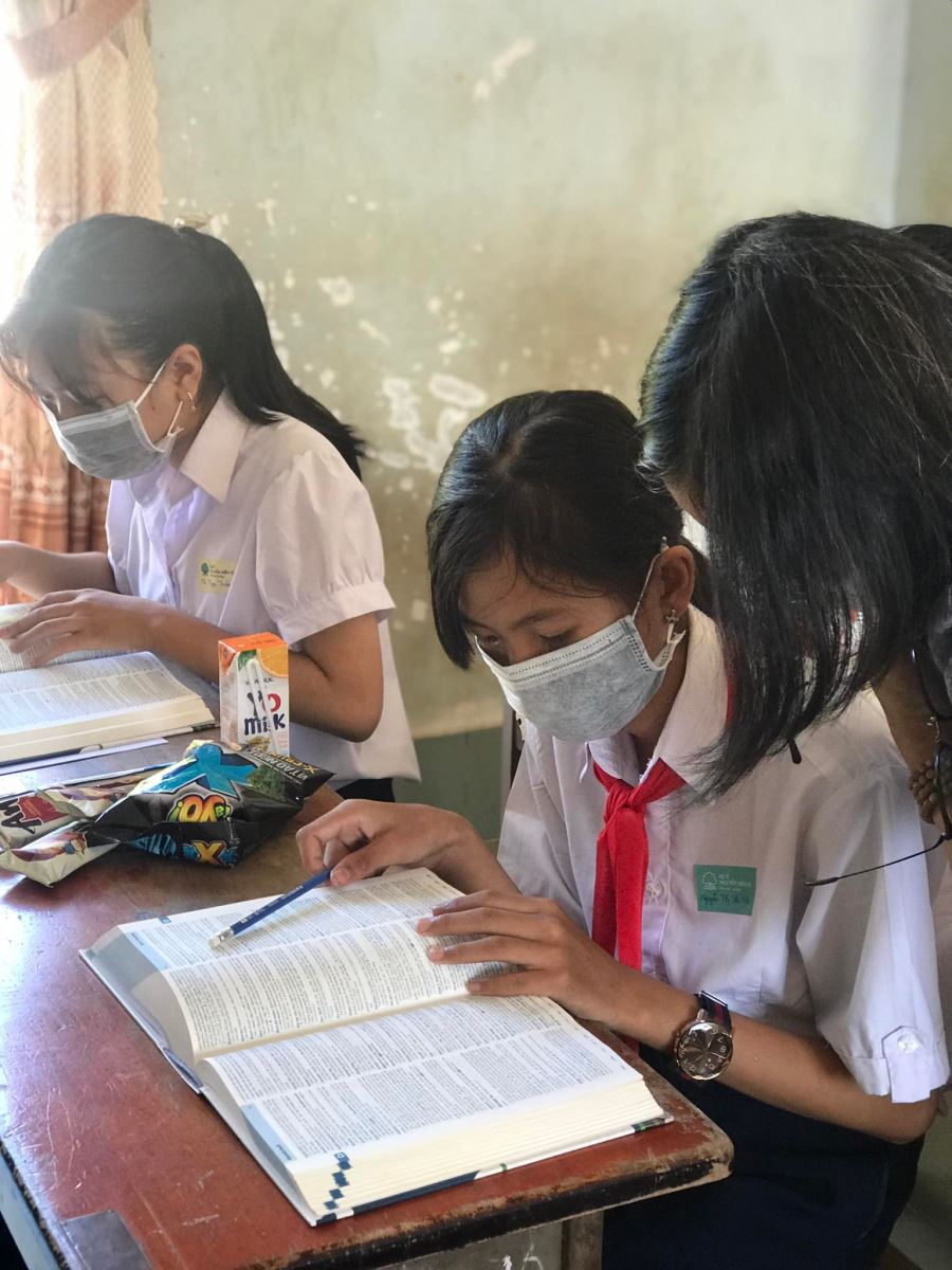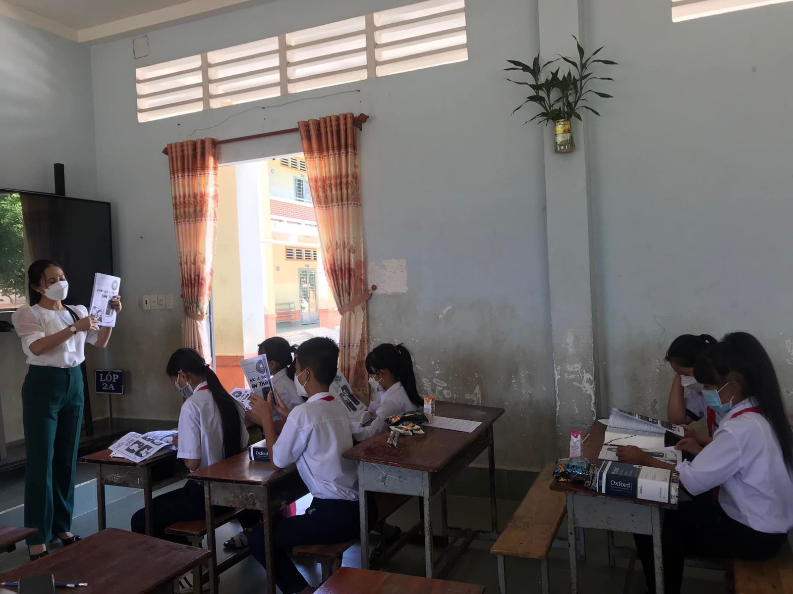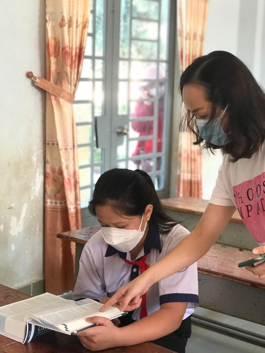 Bên cạnh đó, thành viên Quỹ còn tranh thủ hướng dẫn các em cách sử dụng từ điển Oxford và chia sẻ một số bí kíp về cách phát âm trong tiếng Anh.