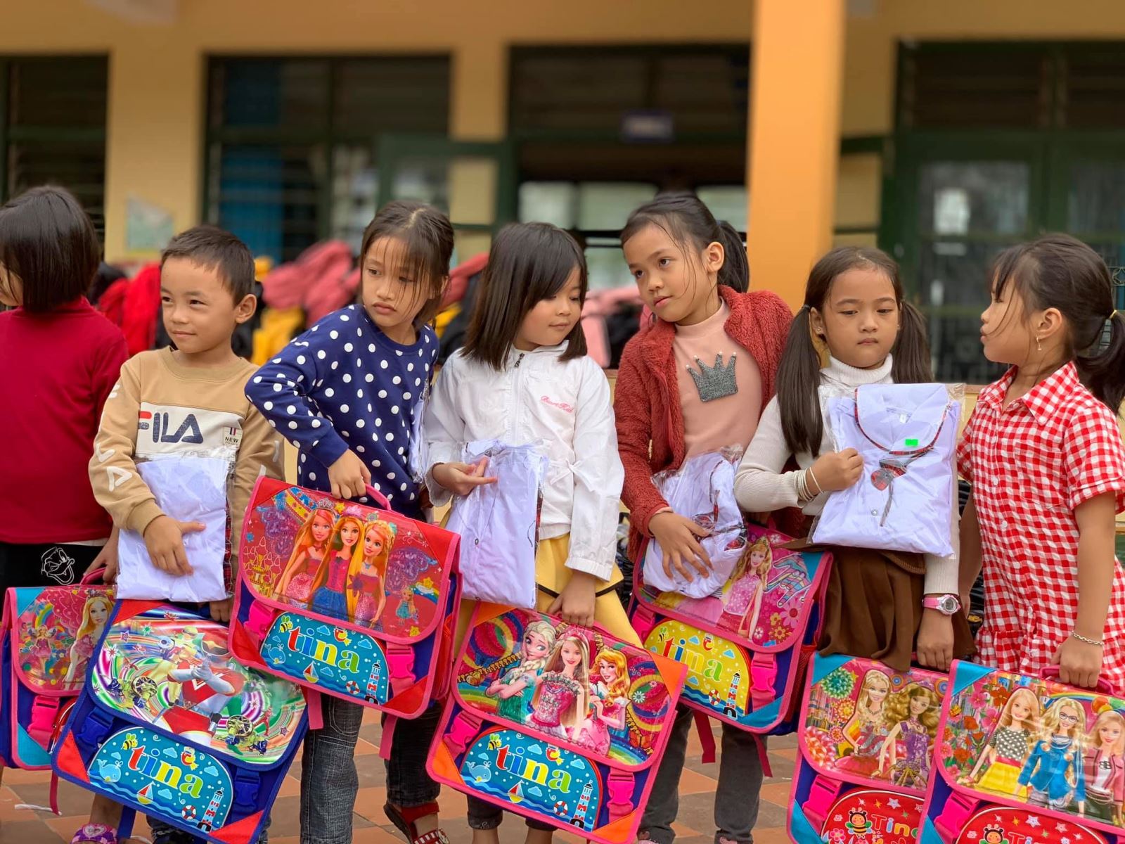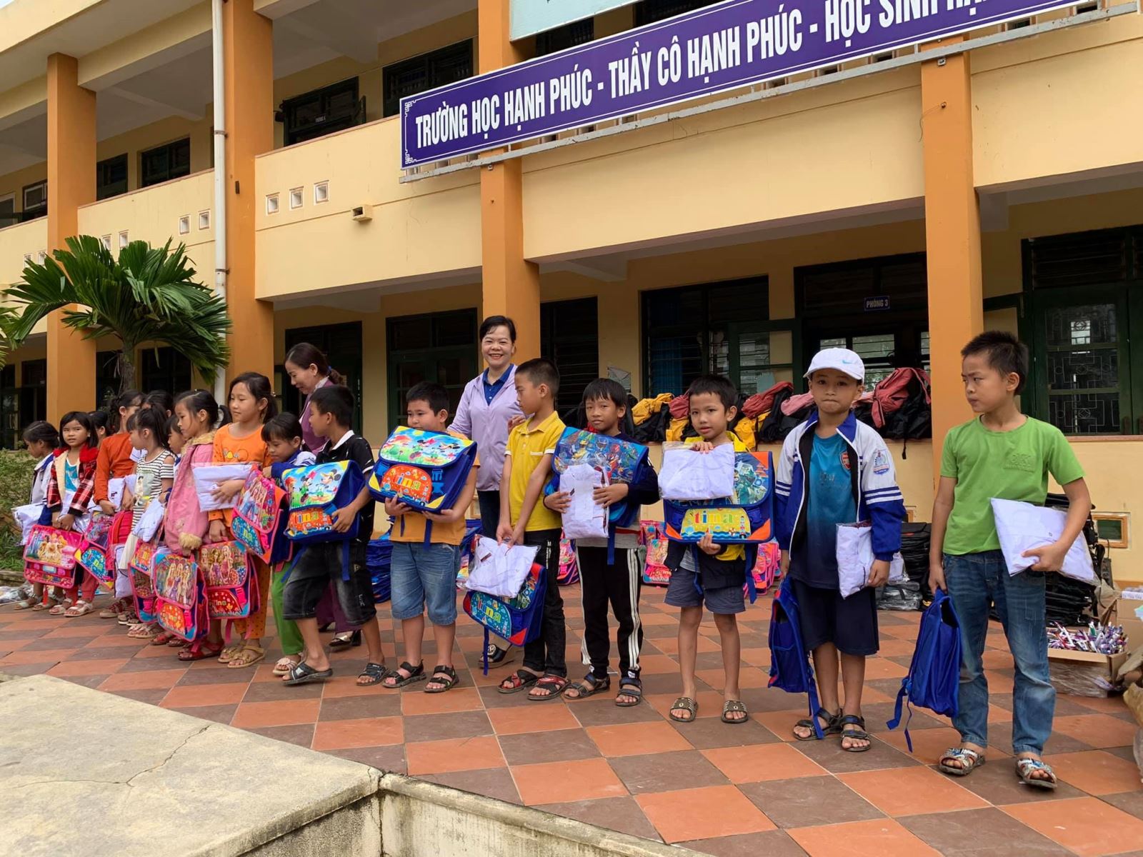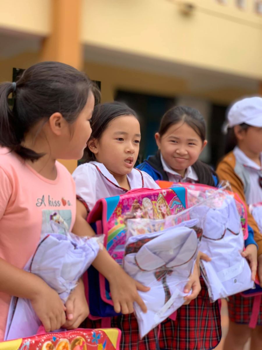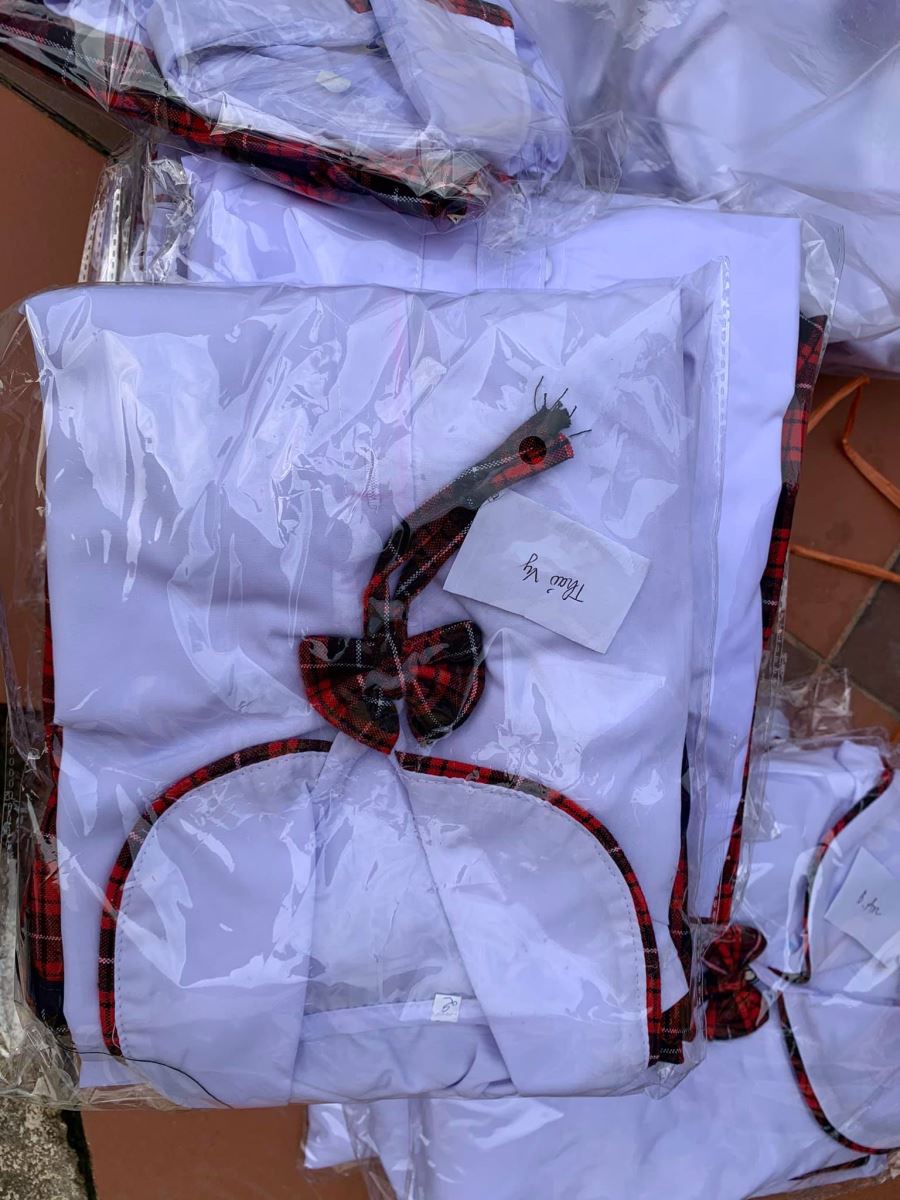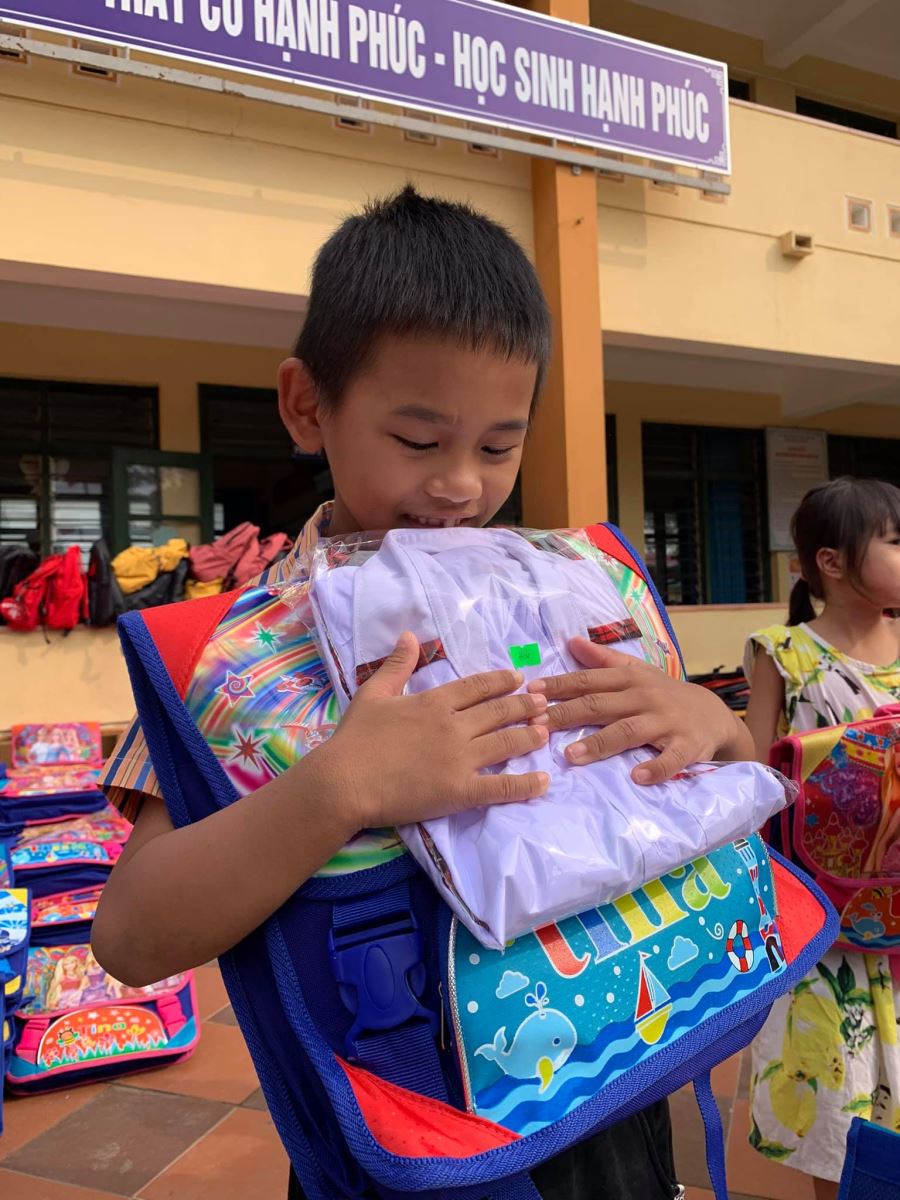 Cảm ơn nhà trường đã đặt may đồng phục kịp thời (chỉ trong vòng 1 tuần sau khi Quỹ gửi chi phí) để hôm nay các em nhận được cùng cặp, giày, dụng cụ học tập, áo mưa, nón...