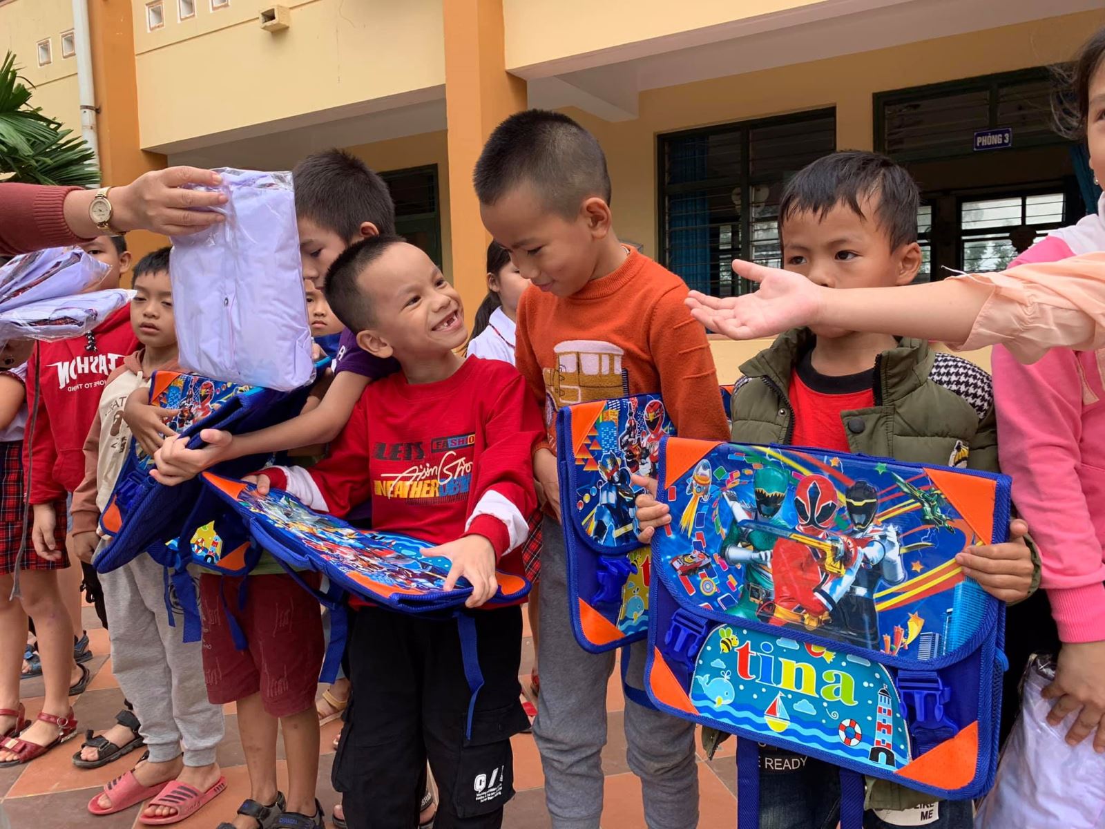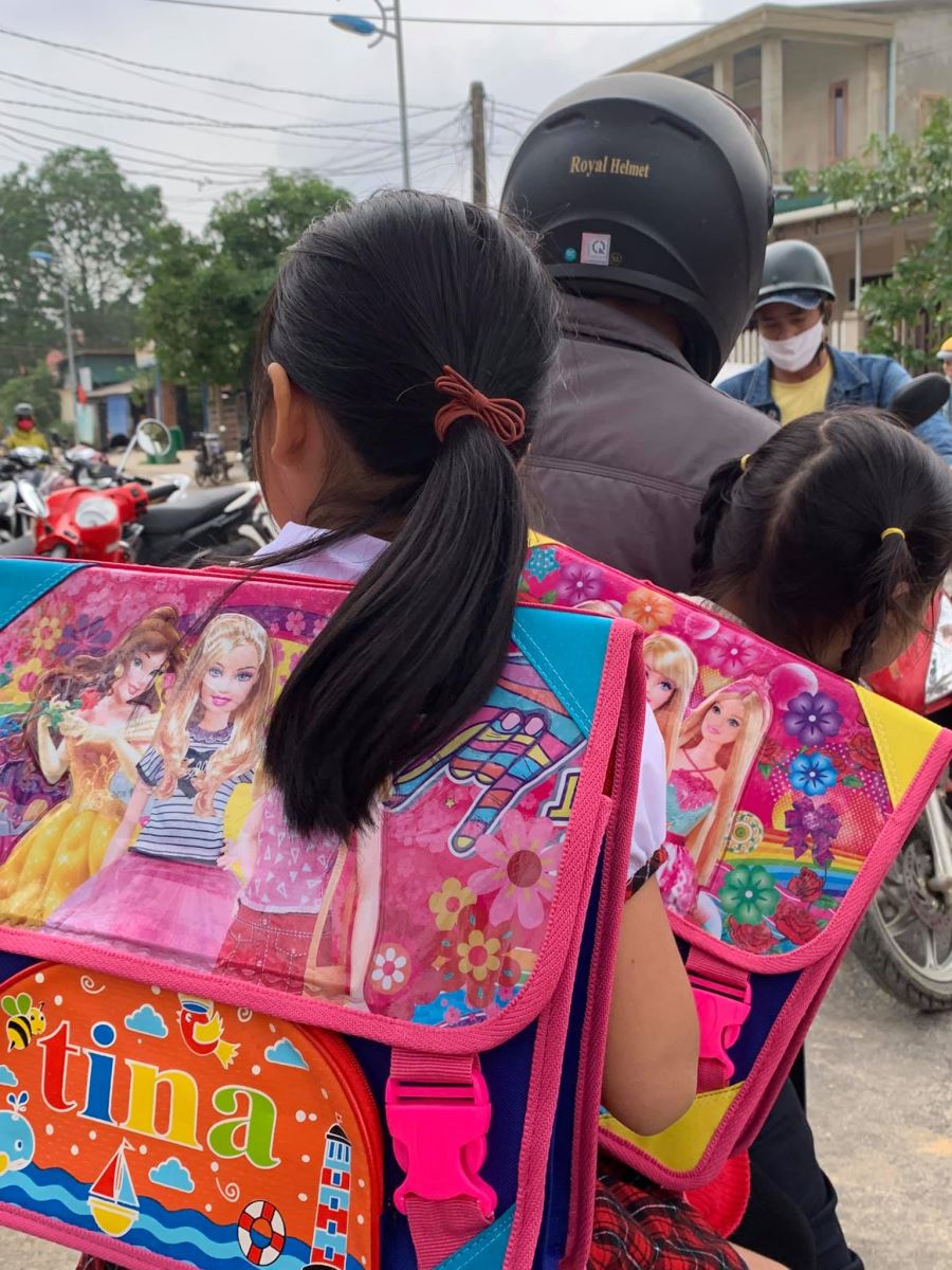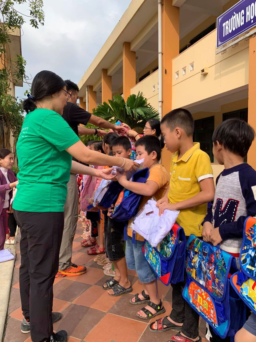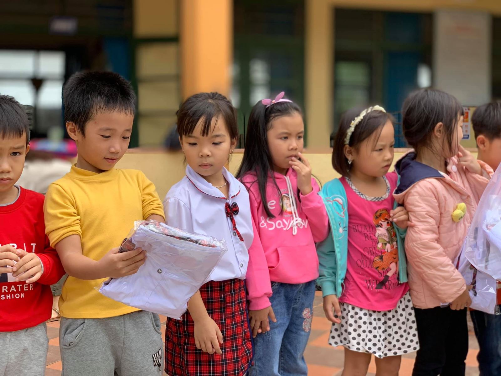 Cảm ơn nhà trường đã đặt may đồng phục kịp thời (chỉ trong vòng 1 tuần sau khi Quỹ gửi chi phí) để hôm nay các em nhận được cùng cặp, giày, dụng cụ học tập, áo mưa, nón...