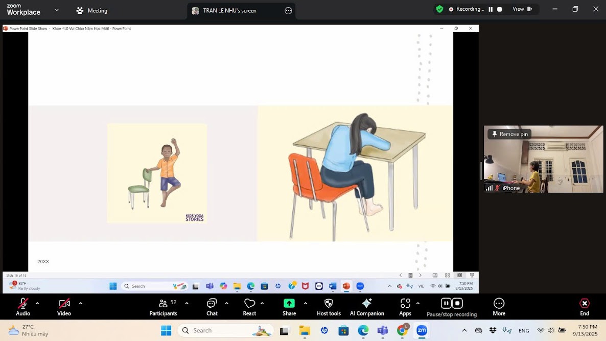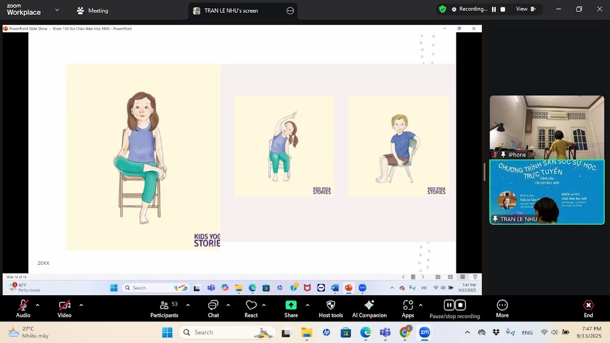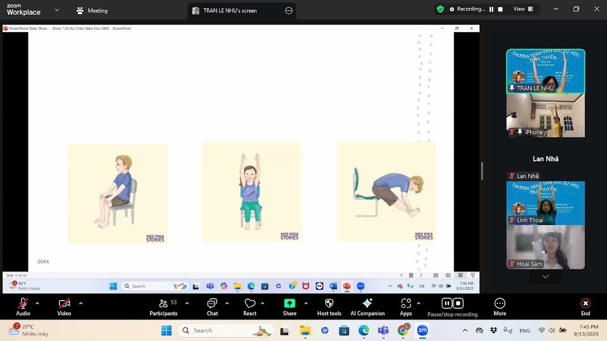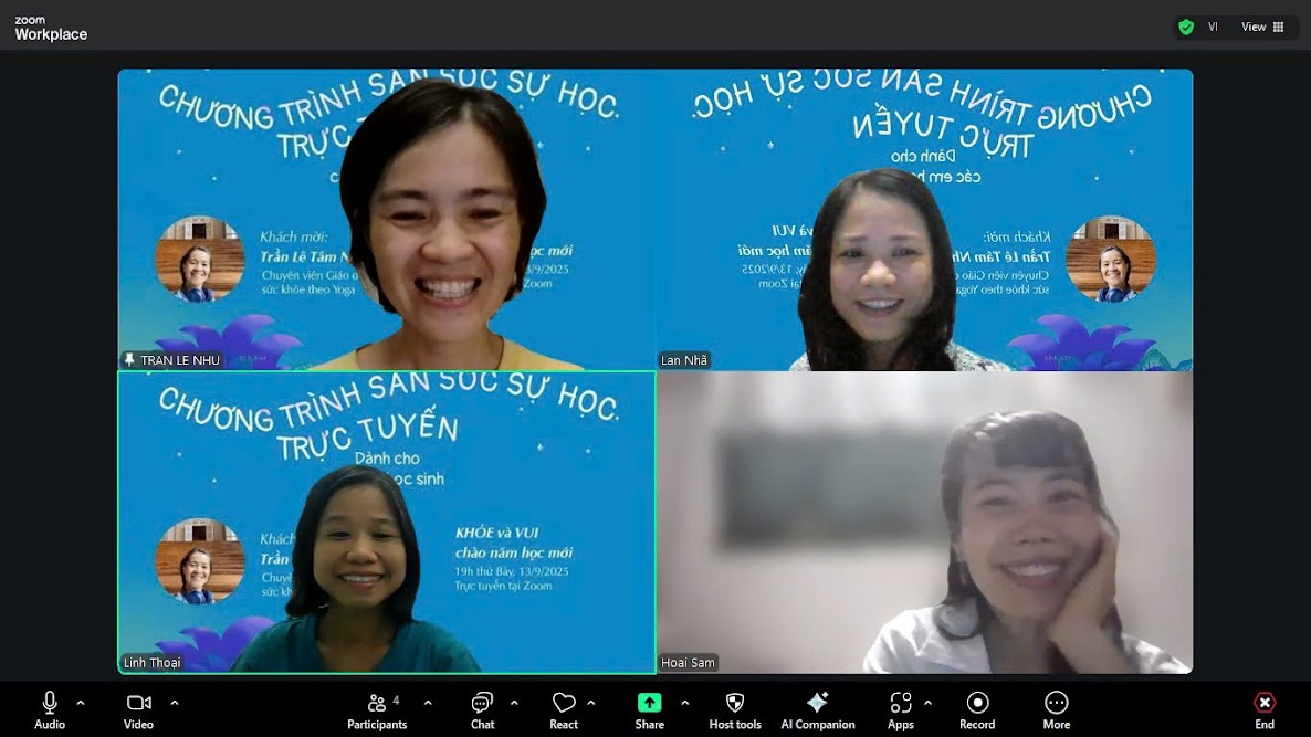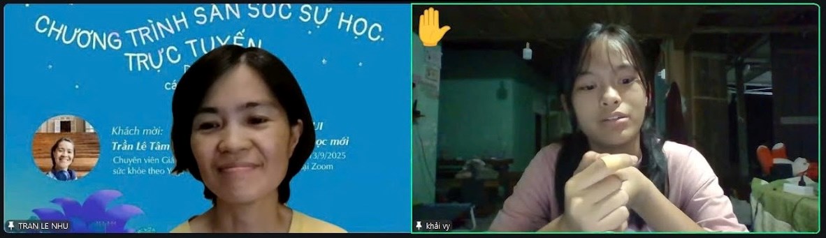 Tối 13-09, gần 50 học sinh trong gia đình học bổng Nguyễn Hiến Lê đã có đêm “zoom” cực kỳ thư giãn cùng với cô Tâm Như - chuyên viên giáo dục sức khỏe theo yoga, khách mời của chương trình săn sóc sự học trực tuyến “Khỏe và Vui chào năm học mới”.