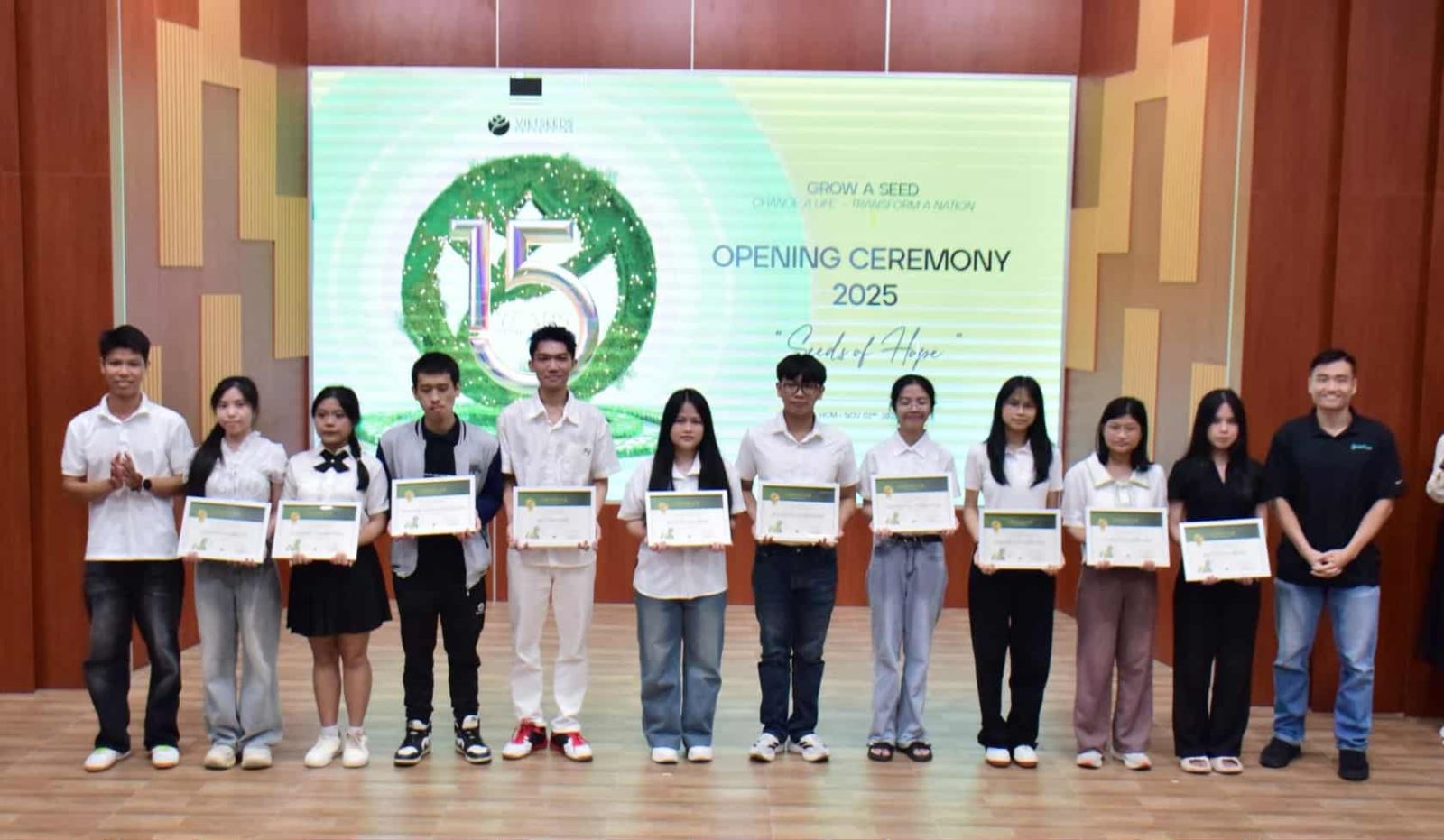 Thanh Vân (thứ năm từ phải sang) tại lễ nhận học bổng VietSeeds - Ảnh: VietSeeds
