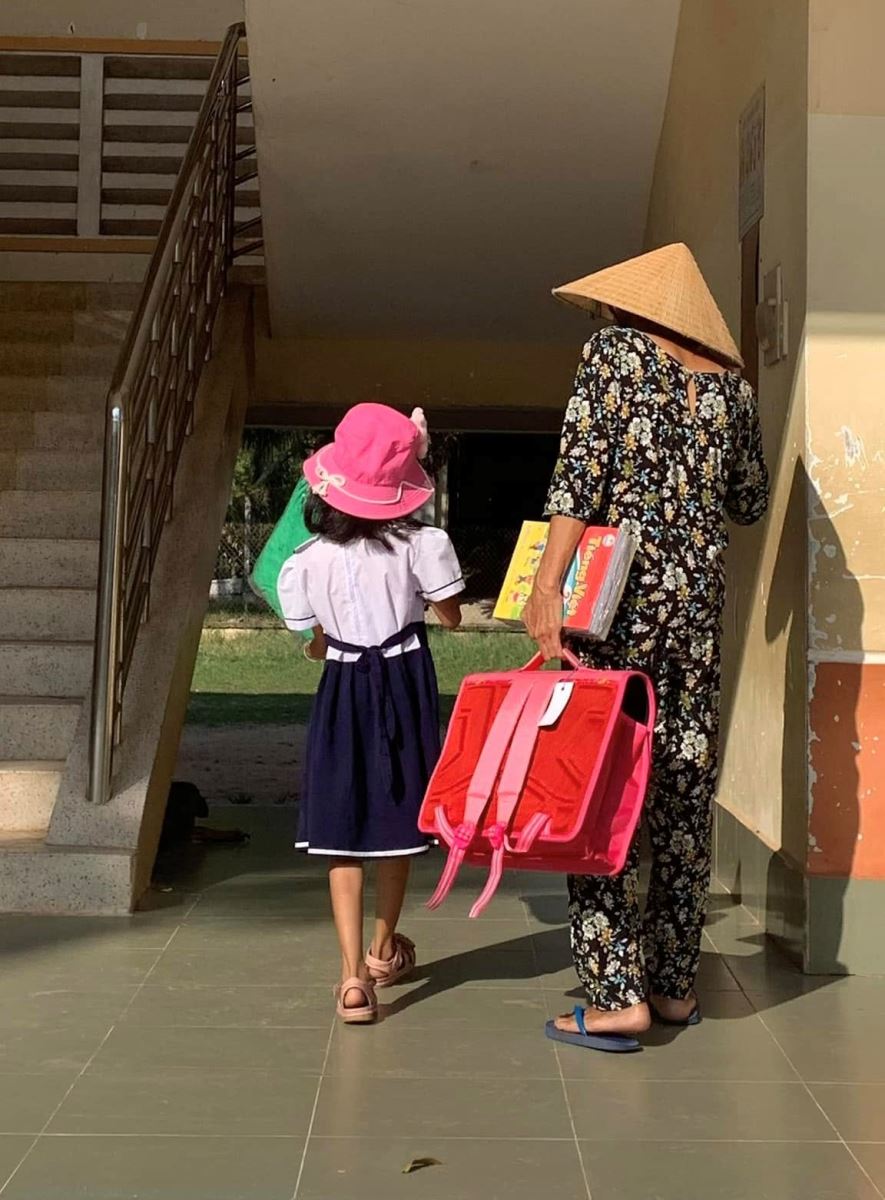 Ảnh trái: Mẹ thử bộ đồng phục cho con gái. Ảnh phải: "Con thích hộp bút nhất!"