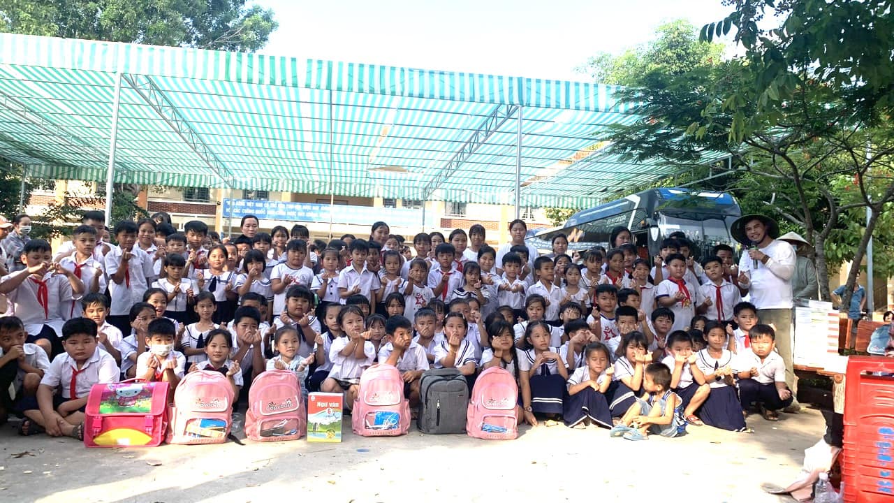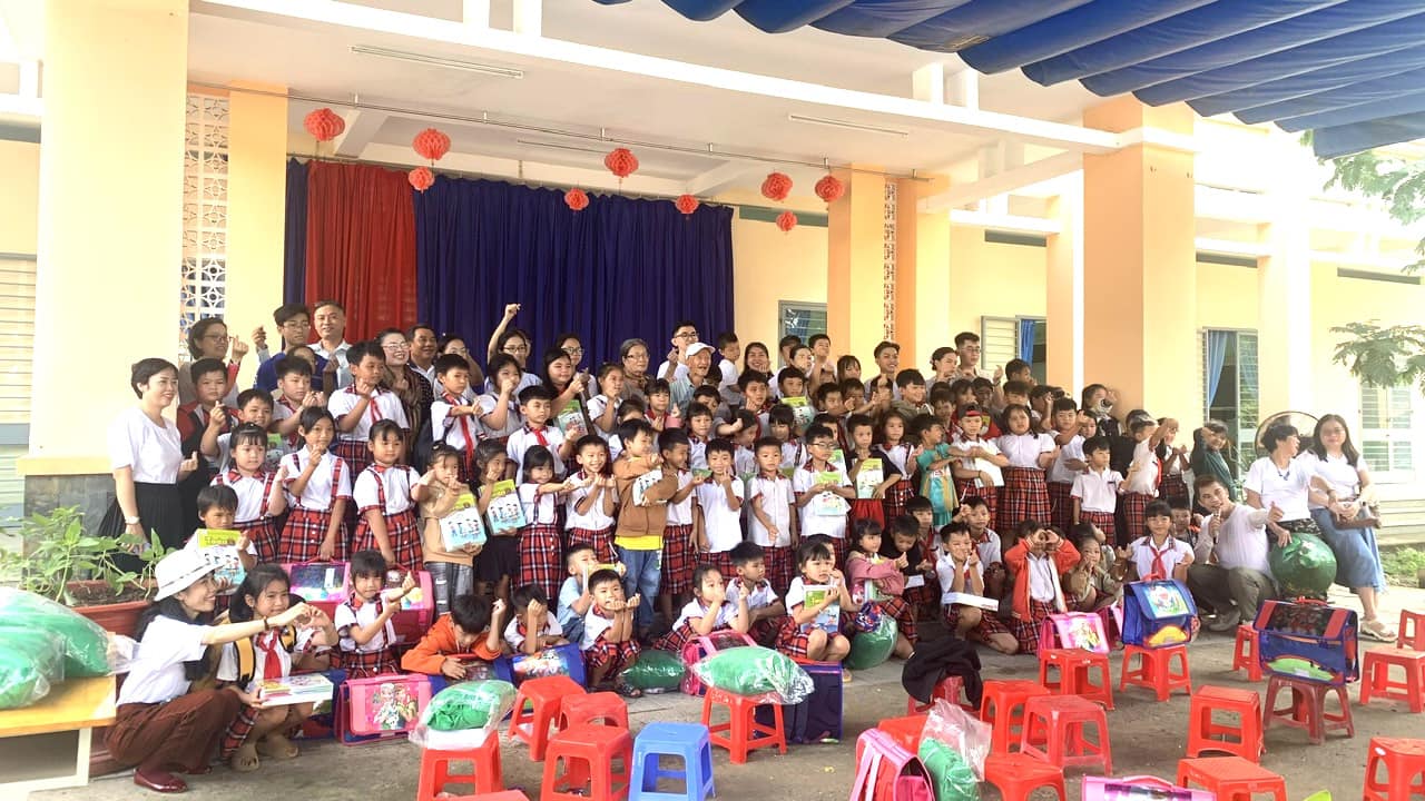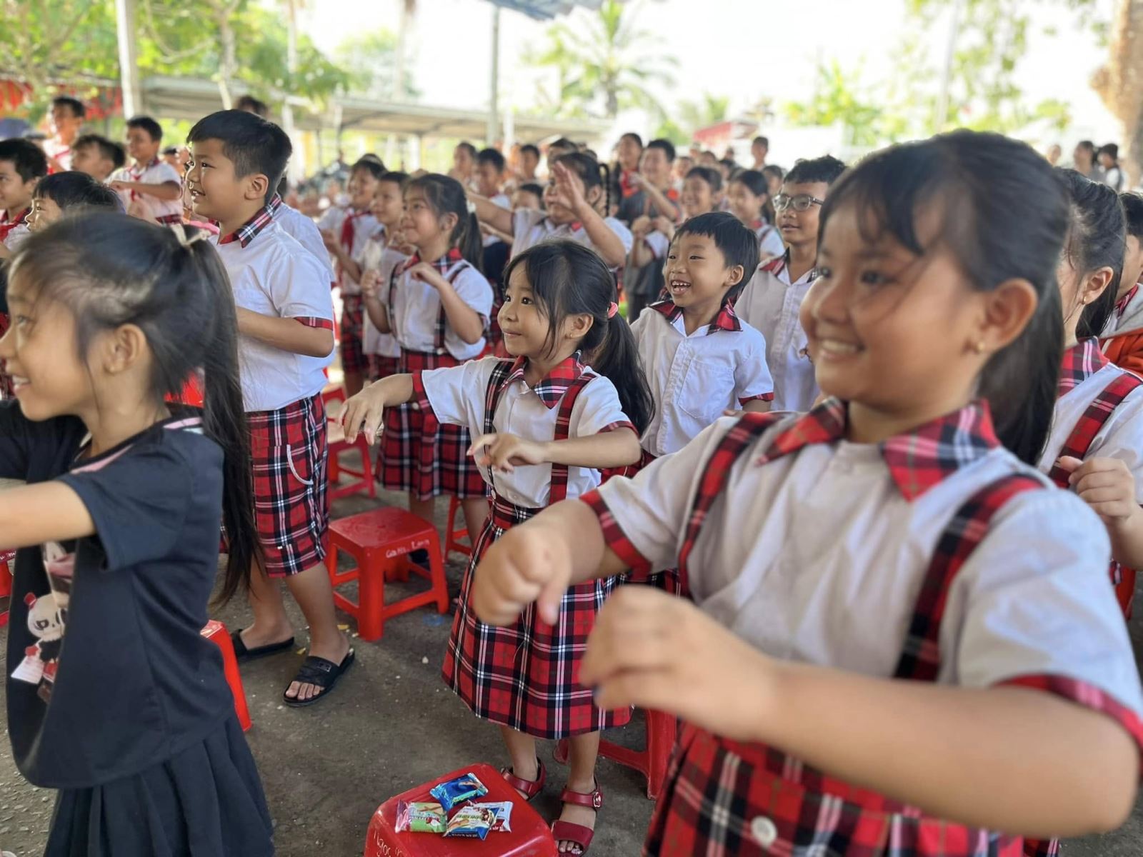 Các em học sinh trường tiếu học Trà Vong B chụp ảnh lưu niệm sau buổi nhận quà