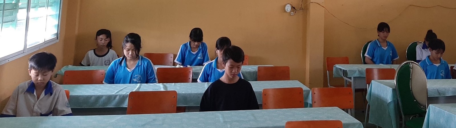Điều phối viên hướng dẫn các em chú tâm vào hơi thở. Quan sát hơi thở vào và hơi thở ra. Để ý sao cho hơi thở Êm – Nhẹ - Sâu - Đều.