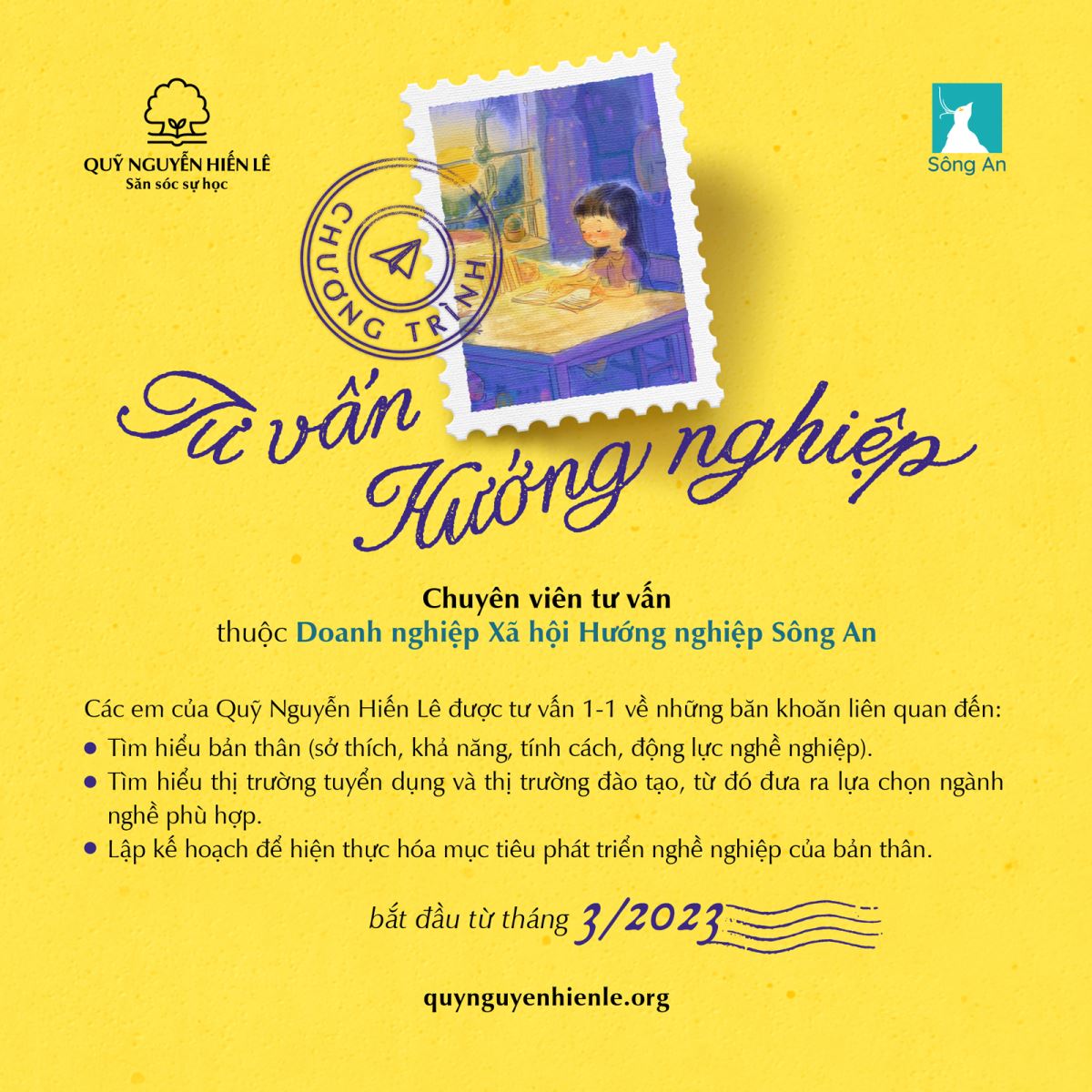 Một tin vui lớn vừa đến với Quỹ chúng mình: Từ tháng 3 này, học sinh nhận học bổng Nguyễn Hiến Lê sẽ được tư vấn hướng nghiệp 1-1 với các chuyên viên tư vấn hướng nghiệp của Sông An - doanh nghiệp xã hội có mạng lưới chuyên viên hướng nghiệp lớn nhất Việt Nam hiện nay.