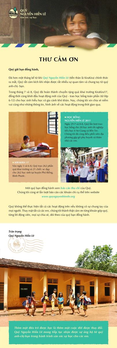 Thật sự, một (hay nhiều) lá thư cảm ơn không thể bày tỏ hết sự cảm kích của Quỹ Nguyễn Hiến Lê về thịnh tình mà quý bạn đồng hành đã gửi đến để săn sóc sự học cho các em thơ.