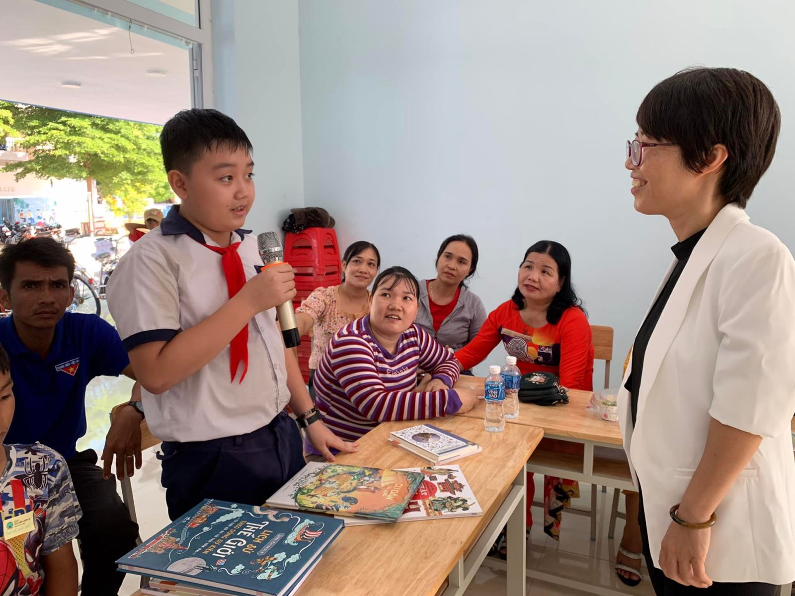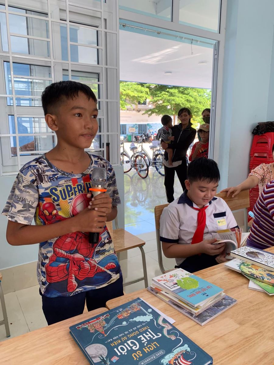 Hôm nay, ngồi bên cạnh các em là những gương mặt đen sạm vì nắng gió, những gương mặt in hằn sự vất vả mưu sinh của các bậc phụ huynh (cha mẹ, ông bà). Thỉnh thoảng những gương mặt ấy lại ánh lên nụ cười khi nhìn con cháu mình đứng trên bục kia nhận quà, rồi phát biểu về việc học, việc đọc cùng các cô chú, anh chị trong Quỹ.