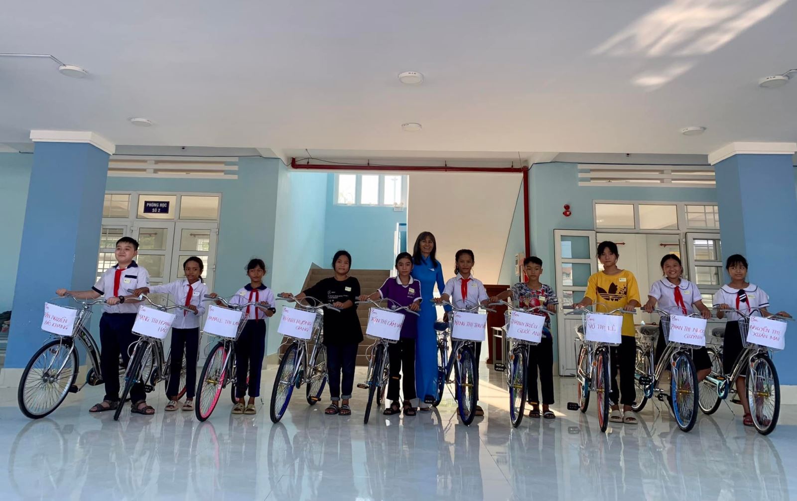 Cảm ơn các cô giáo trường tiểu học Bảo An 2 đã chuẩn bị chu đáo, tươm tất cho buổi lễ trao Học bổng từ chiếc bảng đầy hoa đến bảng tên trên từng chiếc xe đạp.